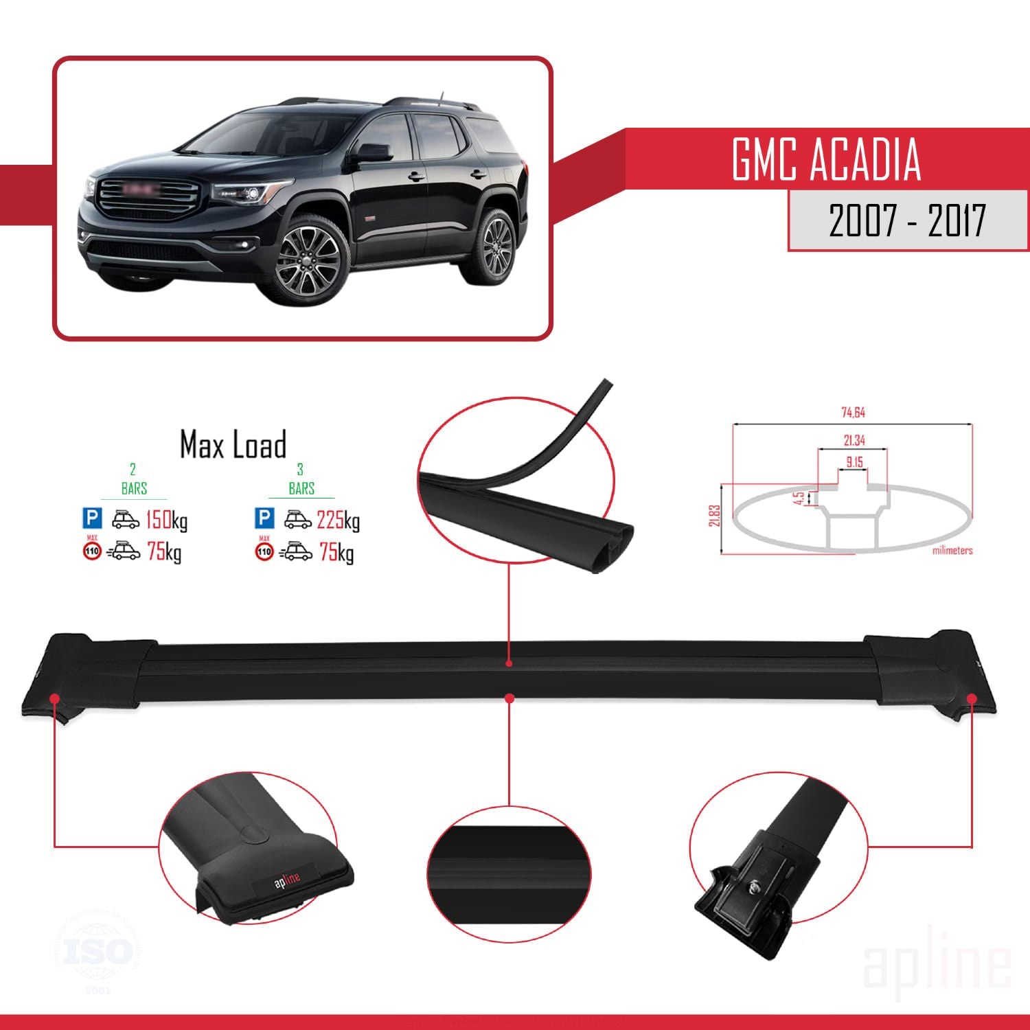 Compatible avec GMC Acadia 2007-2017 FLY Model Barres de Toit Railing Porte-Bagages de Voiture Noir Aluminium 2 Barres