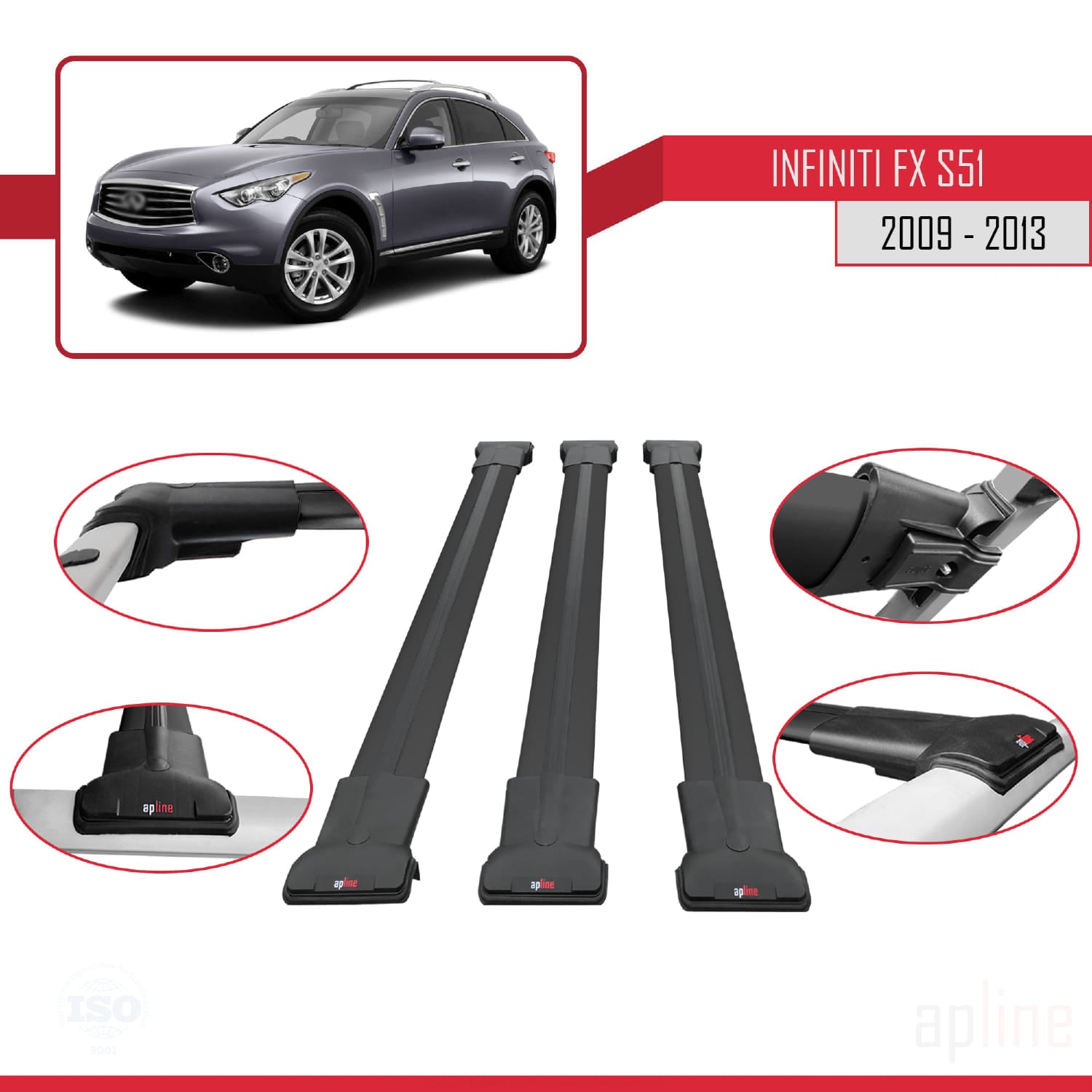 Compatible avec Infiniti FX 2 (S51) 2009-2013 FLY Model Barres de Toit Railing Porte-Bagages de Voiture Noir Aluminium 3 Barres