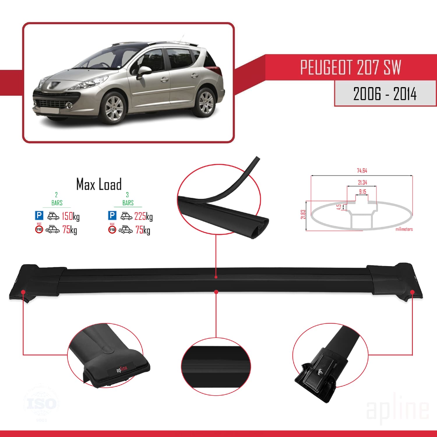Compatible avec Peugeot 207 Break 2006-2014 FLY Model Barres de Toit Railing Porte-Bagages de Voiture Noir Aluminium 2 Barres