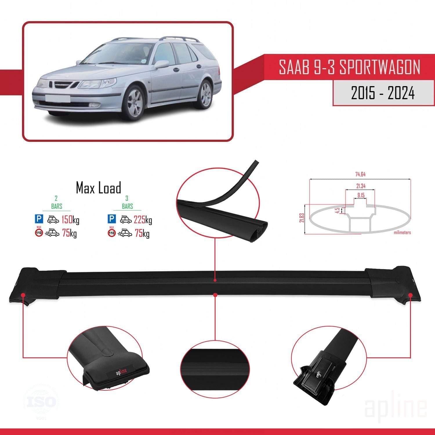Compatible avec Saab 9-3 II Break 2006-2012 FLY Model Barres de Toit Railing Porte-Bagages de Voiture Noir Aluminium 2 Barres